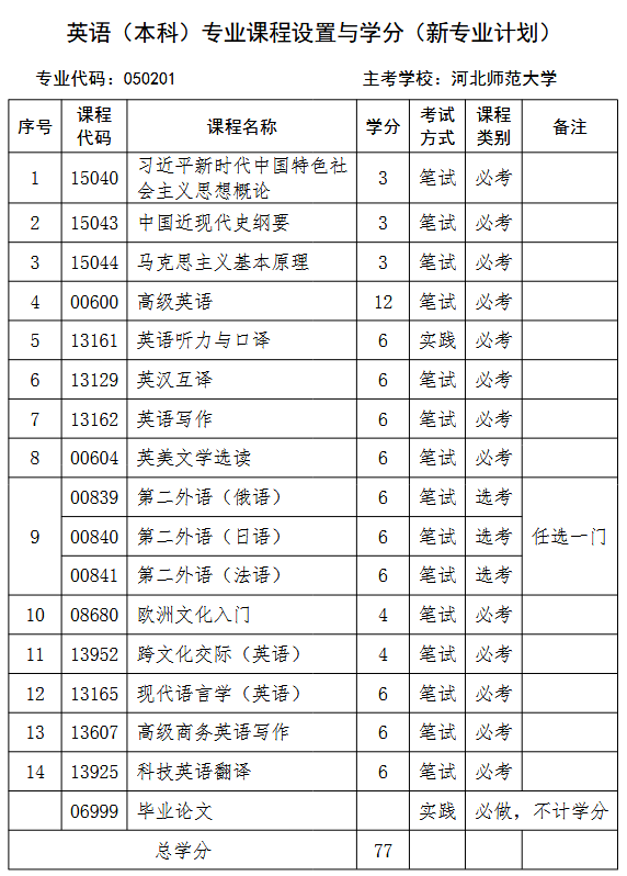 凡取得本专业考试计划规定的13门课程的合格成绩,累计达到74学分,毕业论文达到规定要求,思想品德经鉴定符合要求者,颁发高等教育自学考试英语专业毕业证书。其学业水平达到国家规定的学位标准,并符合主考学校学位授予条件的,由主考学校授予文学学士学位。