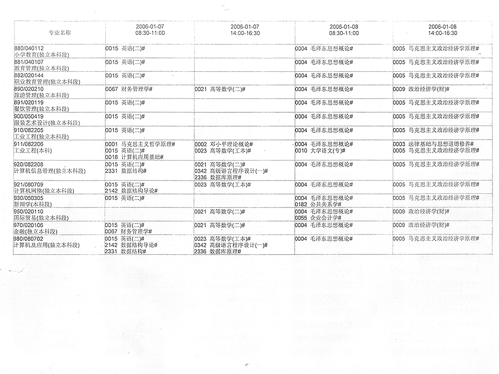 辽宁省2006年1月高等教育自学考试考试课程安排(四)