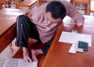 今年4月22-23日,我省上半年自学考试如期举行,漳州一中考场,则出现了一位特殊的考生,给人们带来几分惊讶。他双臂残缺,却能用脚写字,答题流畅,才思敏捷。众人纷纷投以敬佩的目光。这位与众不同、报考厦门大学法律本科专业的自考生叫肖中兵,今年刚满30岁,家住漳州市龙文区朝阳镇登科村。紧张的考试氛围并没有使他胆怯,只见他神闲气定,用右脚趾夹着钢笔,从容作答,嘴角总挂着一抹自信的微笑。他的乐观,他的好学,深深打动了大家的心,也引起了省市巡视员和新闻记者的关注。当时,在漳州巡视督考的省教育厅薛卫民副厅长得知此事后,十分感动,反复交代随行的工作人员,要大力宣传这一典型,要给予一定的褒奖。5月6日,闽南日报第二版即以醒目的位置刊登了记者姚兆羽、江少菁采写的报道——《残臂青年肖中兵用双脚去圆律师梦》。于是,鲜为人知的肖中兵名字以及他自强不息的事迹很快在闽南地区不胫而走,传为美谈。