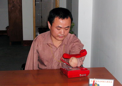 不知不觉,几分钟后,我们一行来到了龙文区残联,由于事先有约,区教育局、区残联领导以及肖中兵的同事们早就等候在门口了。初一望去,站在最前面的一位中等个子、身体文弱的年轻人在不停地向我们点头致意,两只空荡荡的袖筒在微风中飘动,略显单薄。我想,这应该就是肖中兵了。互相间问候后,我们便走进残联办公室,坐下不久,肖中兵主动给我们谈起小时候的往事以及生命历程中出现的几次奇迹。