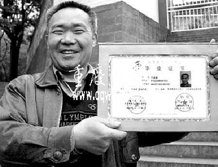 1999年,他参加考试通过1科,2000年通过2科,2001年通过3科……就这样,凭借不懈的努力,老于花费8年时间终于通过了全部16科考试。今年初,58岁的他终于拿到了重庆医科大学自考大专毕业证书,成为家里第二个大学生(于的女儿2004年考上重庆师范大学)。老于说,7年来,他几乎把数十万字的教材完整抄写了两遍,累积的草稿纸达30多厘米。
