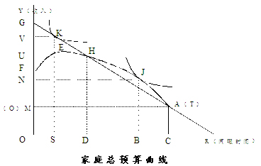 例如,下图是一个典型家庭总预算曲线,其中,曲线AJEF为家庭生产曲线,直线AG为家庭成员从事市场劳动的预算约束线,丈夫的无差异曲线在K点与曲线AG相切,妻子的无差异曲线在J点与曲线AJEF相切。