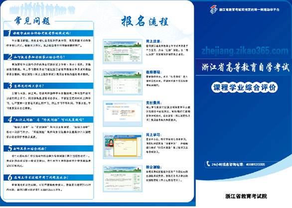 为确保考生报名工作的顺利进行,特开通课程学业综合评价24小时报考咨询电话4008135555,0574-27872528节假日、周末全年无休,欢迎考生随时拨打咨询。其它报考事宜,可详见《浙江省高等教育自学考试课程学业综合评价》。