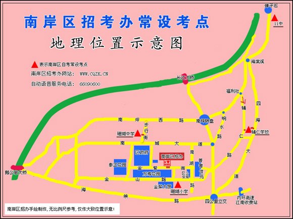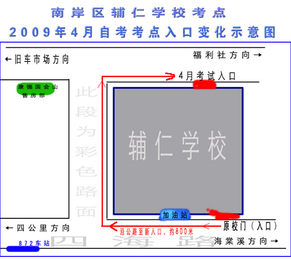 南岸区辅仁学校考点因学校扩建,学校校门位置发生变化,原校门已完全封闭不能进校(注意是完全封闭),计划中新建的正校门由于正在施工无法通行,因此考生仅能从后校门进入学校。同时,学校不能向考生提供车辆入口和停车场。由此给你的不便敬请谅解。