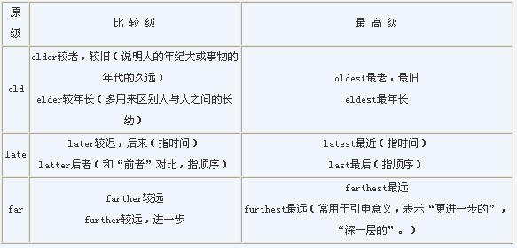 (1) 有些形容词和副词的比较级和更高级有两种不同形式,它们在意义上也有所不同: