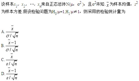 答案解析:本题考查假设检验中统计量的选择。由已知可判定本题属于“单正态总体、方差未知,对均值的检验”,应选择“t统计量”,故选择D。