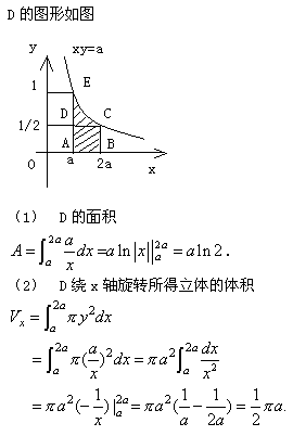 1.设D是由双曲线xy=a(a>0)和直线x=a,x=2a及x轴围成的平面区域,求