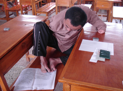 今年7月,他将获得厦门大学法学自学考试本科文凭。为了这一天,1976年出生的他已经奋斗了整整27年。省高等教育自学考试办公室宣传科苏良琪老师说,肖中兵是福建省唯一的一个用脚趾来答题的自考生。