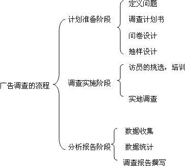 在广告运作过程中,市场调查的流程因不同的调查目的、不同的产品、不同的调查对 象而有所差异,但其基本步骤大致相同。概括起来主要有计划准备阶段、实施阶段和分析 报告阶段。图所示为一个较为详细的市场调查流程图。