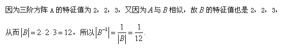 设3阶矩阵A与B相似,且已知A的特征值为2,2,3.则|B-1|=( )