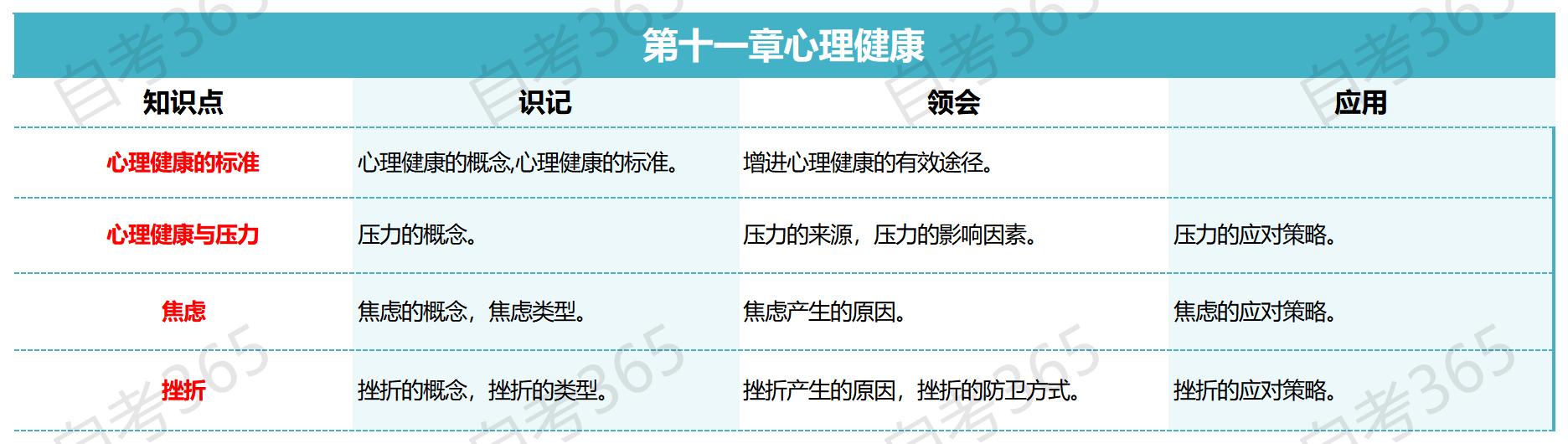 在备考2024年自考心理学之前,我们需要知道心理学这门科目的复习框架,了解哪些知识点需要重点复习,是必须要识记、要理解、要学会综合应用的,下面就让我们一起来看一下自考心理学第十一章-心理健康的复习框架吧!